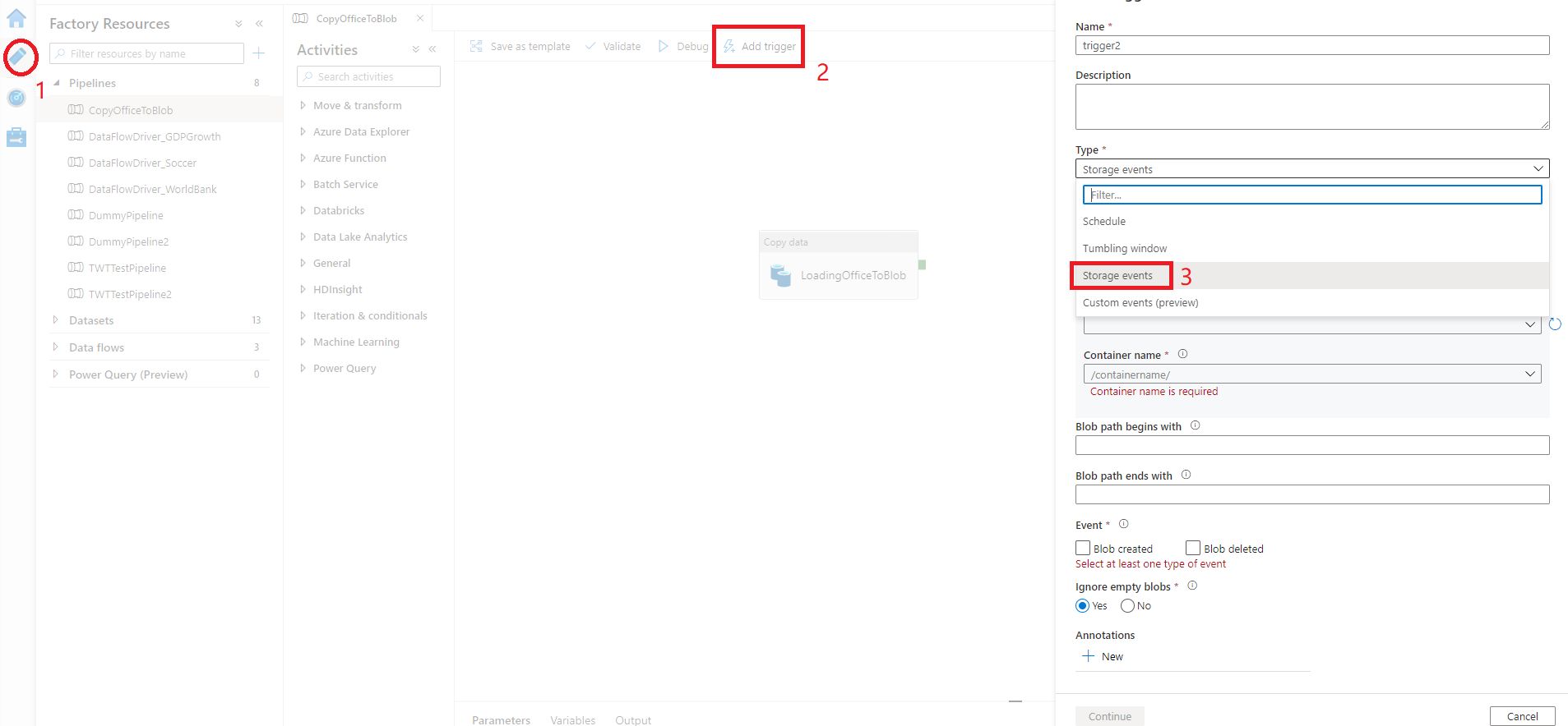 本部分介绍了如何在 Azure 数据工厂和 Azure Synapse Analytics 管道用户界面 (UI) 中创建存储事件触发器。