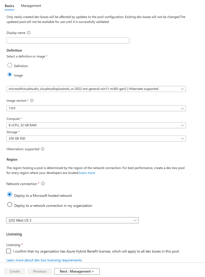 2. 为开发箱选择所需的部署区域。 选择靠近预期开发箱用户的区域,以获得最佳的用户体验。许可 选中此复选框即表示确认组织具有要应用于此池中的开发箱的 Azure 混合权益许可证。 在 “管理 ”选项卡上,输入以下值:
