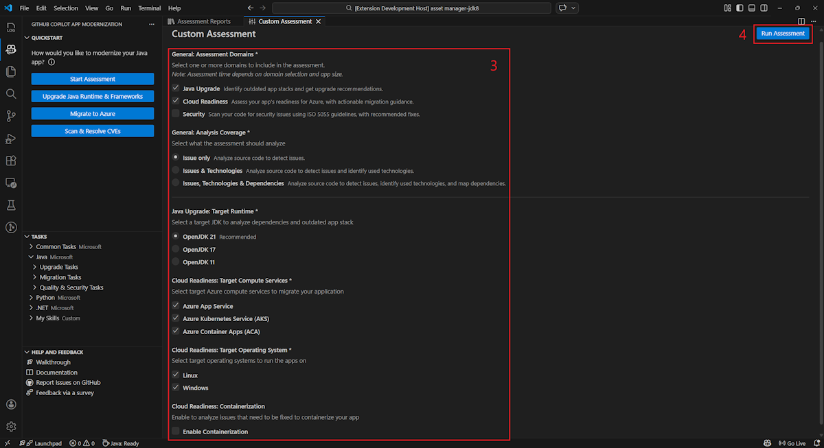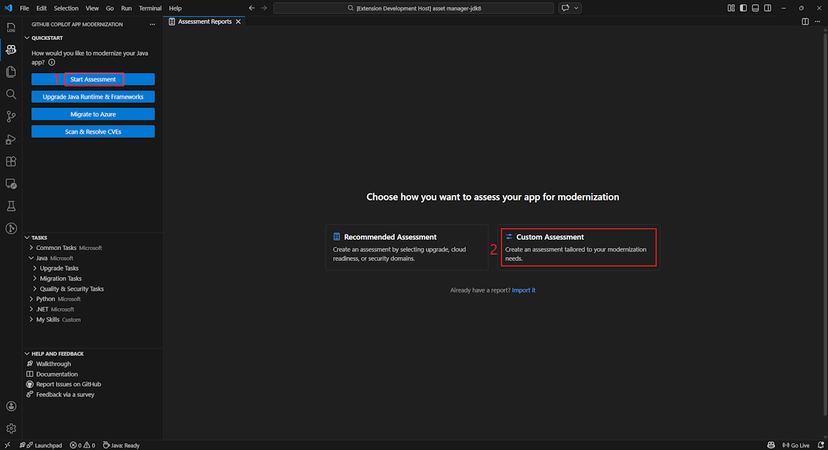 - 在 GitHub Copilot 现代化窗格的“快速入门”部分选择“开始评估”或“打开评估仪表板”。