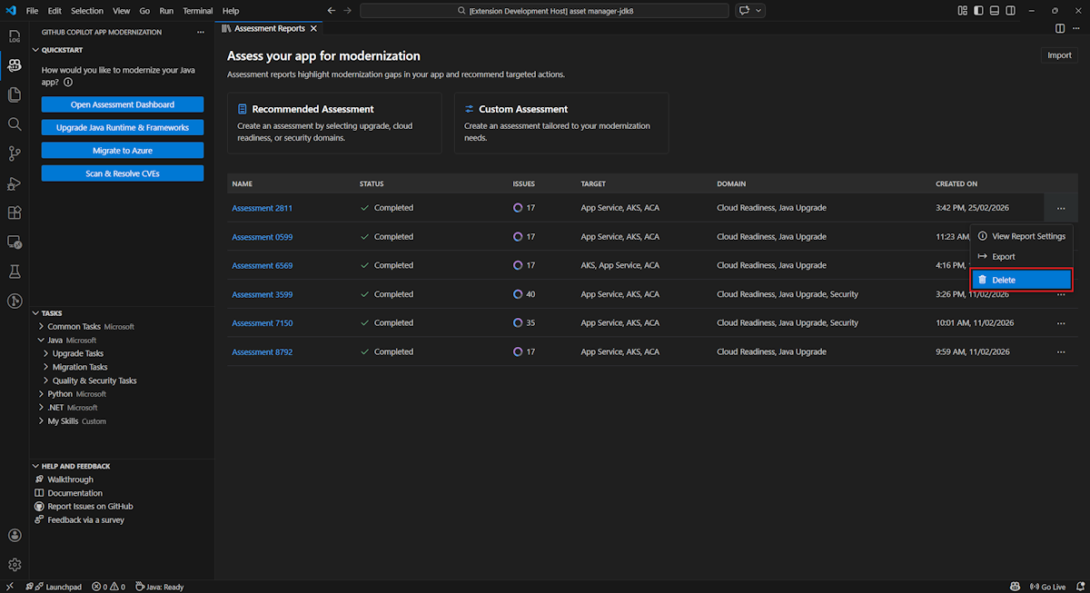 若要删除评估报告,请右键单击“ 评估报告 ”,然后选择“ 删除”。