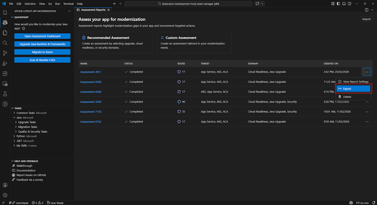 若要从 GitHub Copilot 现代化导出评估报告,请在报表列表中选择目标报表上的“ ...”( 更多操作)按钮,然后选择“ 导出”。