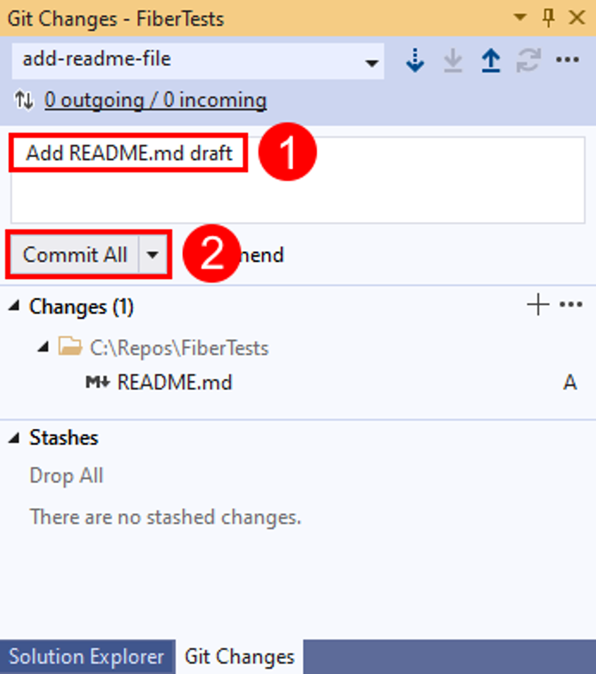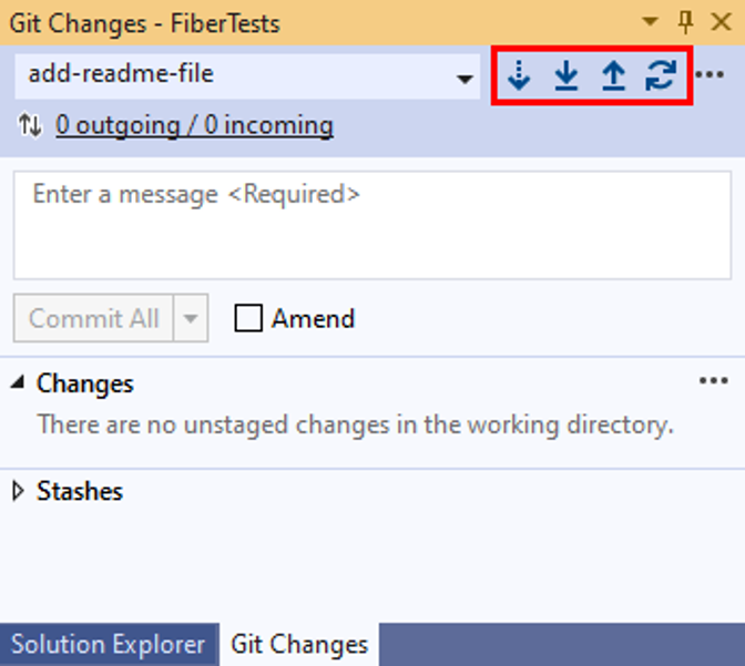 如果对更改感到满意,请使用提交将其保存在 Git 中。 在“Git 更改”窗口中,输入描述更改的消息,然后选择“全部提交”。 “全部提交”会提交非暂存更改并跳过暂存区域。 可以通过选择“Git 更改”窗口中“更改”部分顶部的全部暂存 +(加号)按钮,选择在提交前暂存所有文件。