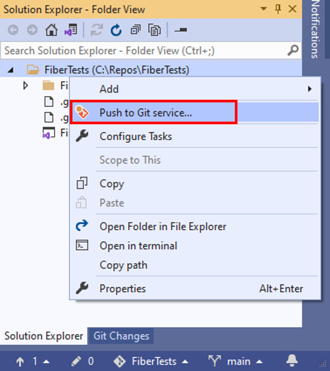 通过右键单击解决方案资源管理器中的解决方案名称,然后选择“推送到 Git 服务”以启动“创建 Git 存储库”窗口,连接到 Azure DevOps 存储库。
