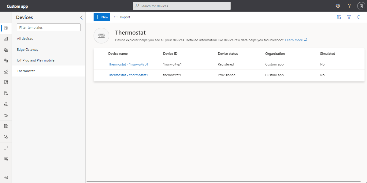 在左窗格中选择 “设备 ”。 在这里,你将看到设备模板的列表,以及组织可访问的所有设备的列表。