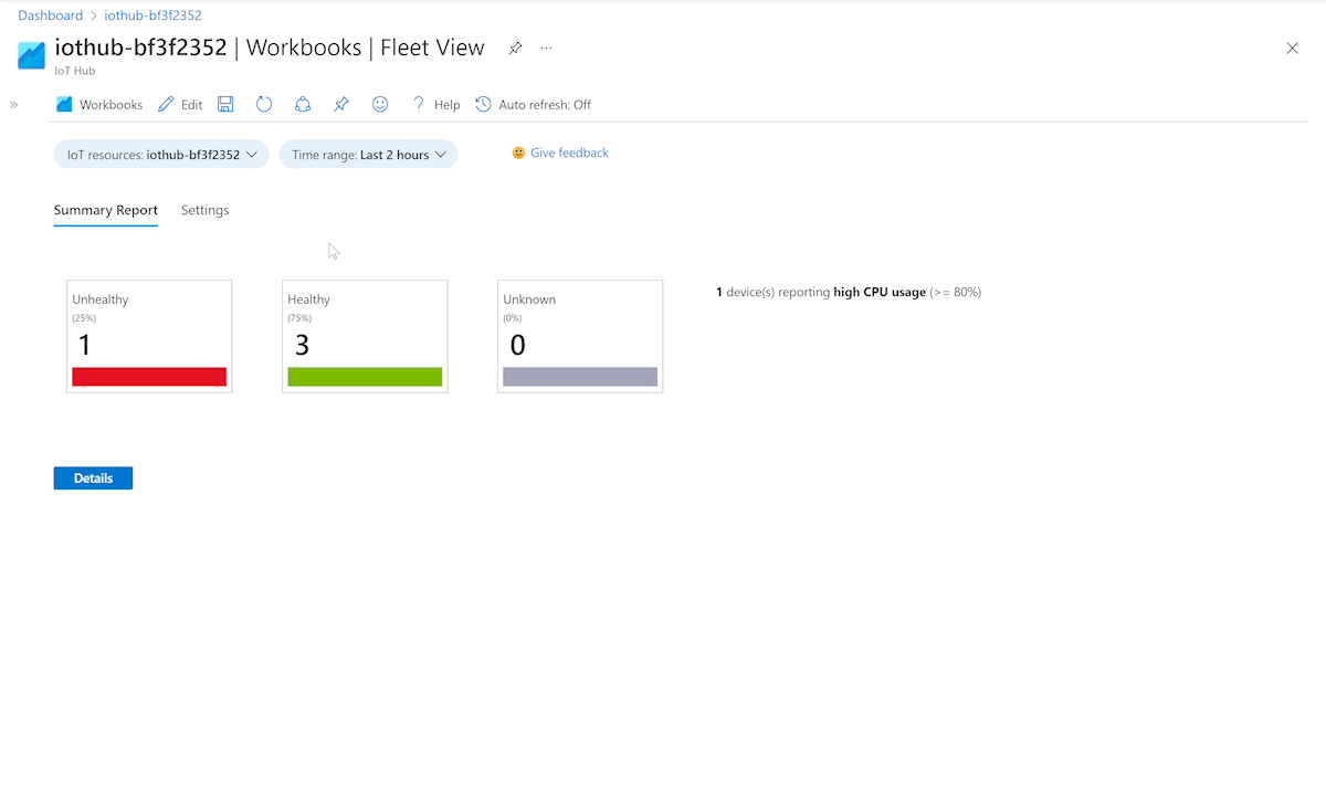 - 对于连接到 IoT 中心的设备,请从 Azure 门户中的“IoT 中心”页面导航到“监视”部分中的“工作簿”页。