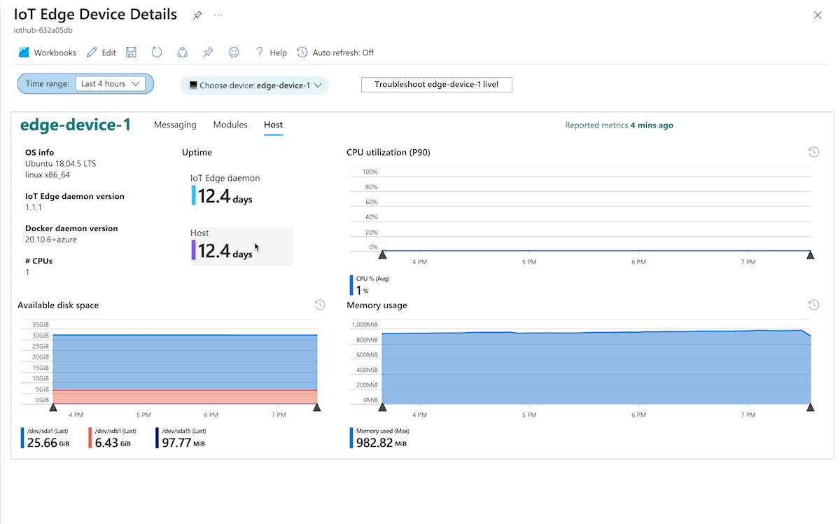 设备详细信息:可视化有关 IoT Edge 设备上的消息传送、模块和主机组件的设备详细信息。