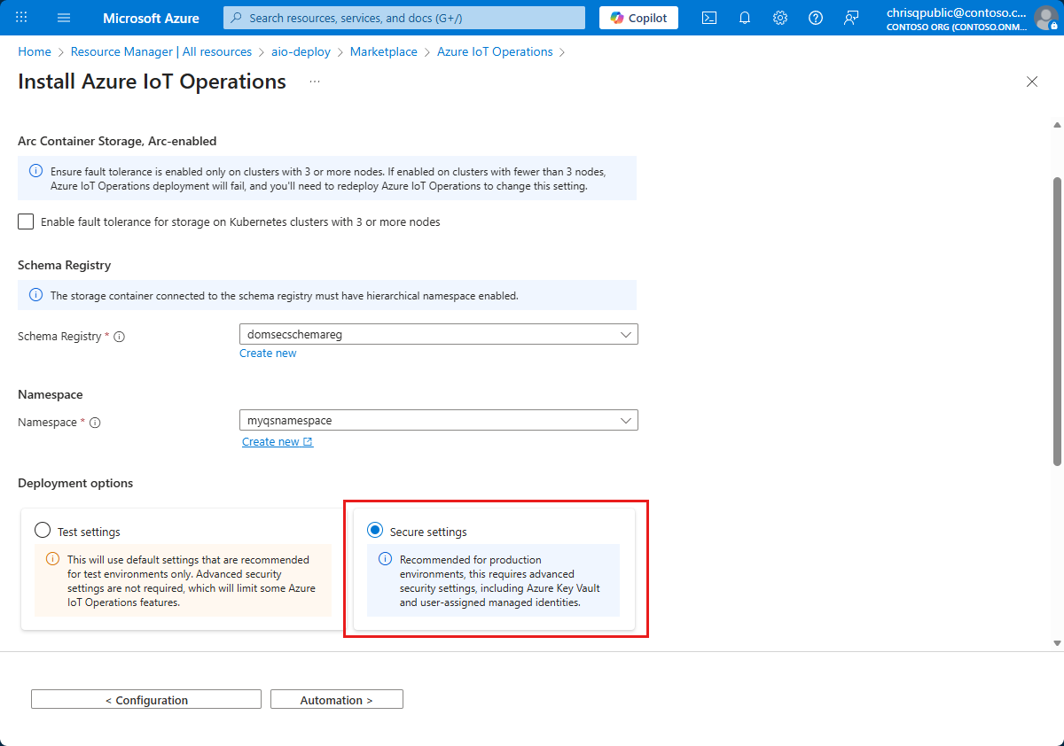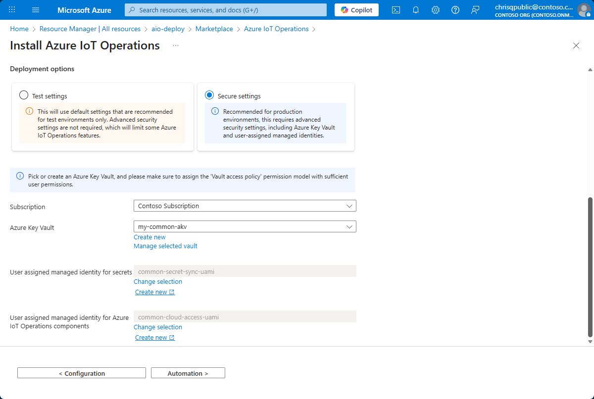 如果已将 Azure IoT 操作的测试实例部署到群集,并且想要将同一群集用于生产场景,请按照“在现有 Azure IoT 操作实例上启用安全设置”中的步骤进行操作。