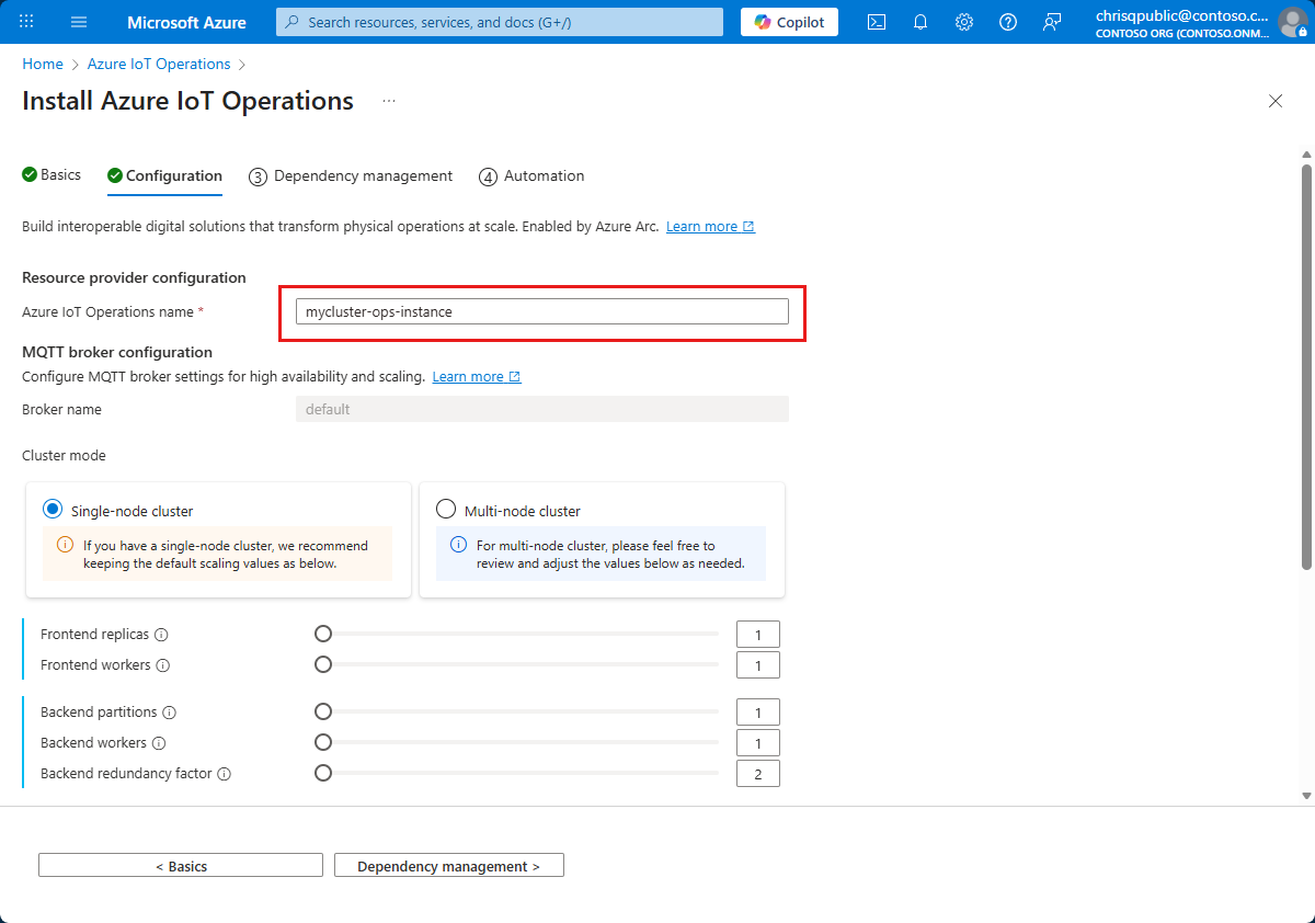 参数 价值 Azure IoT 操作名称 可选:替换 Azure IoT 操作实例的默认名称。 MQTT 代理配置 可选:编辑 MQTT 代理的默认设置。 在 Azure 门户中,可以配置基数和内存配置文件设置。 若要配置其他设置,包括磁盘支持的消息缓冲区和高级 MQTT 客户端选项,请参阅 Azure CLI 支持高级 MQTT 代理配置。 数据流配置文件配置 可选:编辑数据流的默认设置。 有关详细信息,请参阅 “配置数据流配置文件”。 选择“下一步: 依赖项管理”。