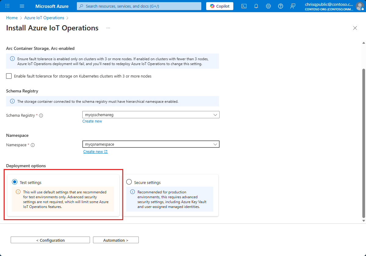 已部署的 Azure IoT Operations 实例已配置为测试场景。 如果要启用安全设置并为生产方案准备实例,请按照 现有 Azure IoT作实例上的“启用安全设置”中的步骤作。
