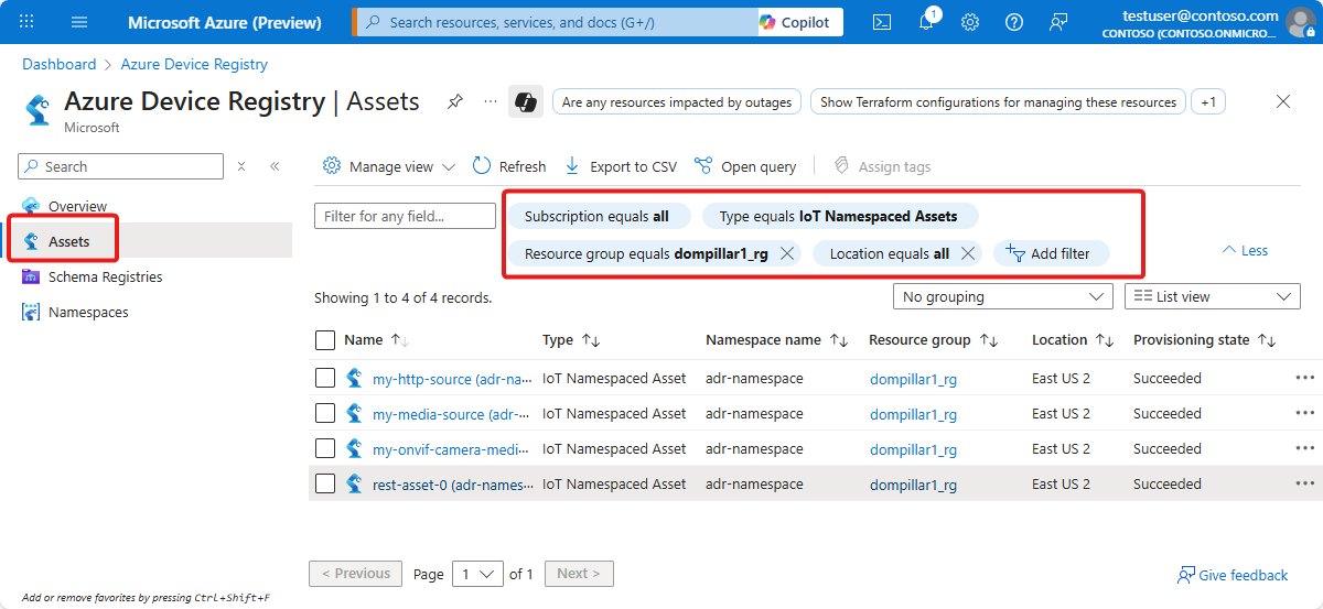 使用“资产”页查看 Azure 设备注册表中的资产。 默认情况下,“资产”页显示订阅中所有命名空间中的资产。 使用筛选器查看资产子集,例如特定命名空间或资源组中的资产: