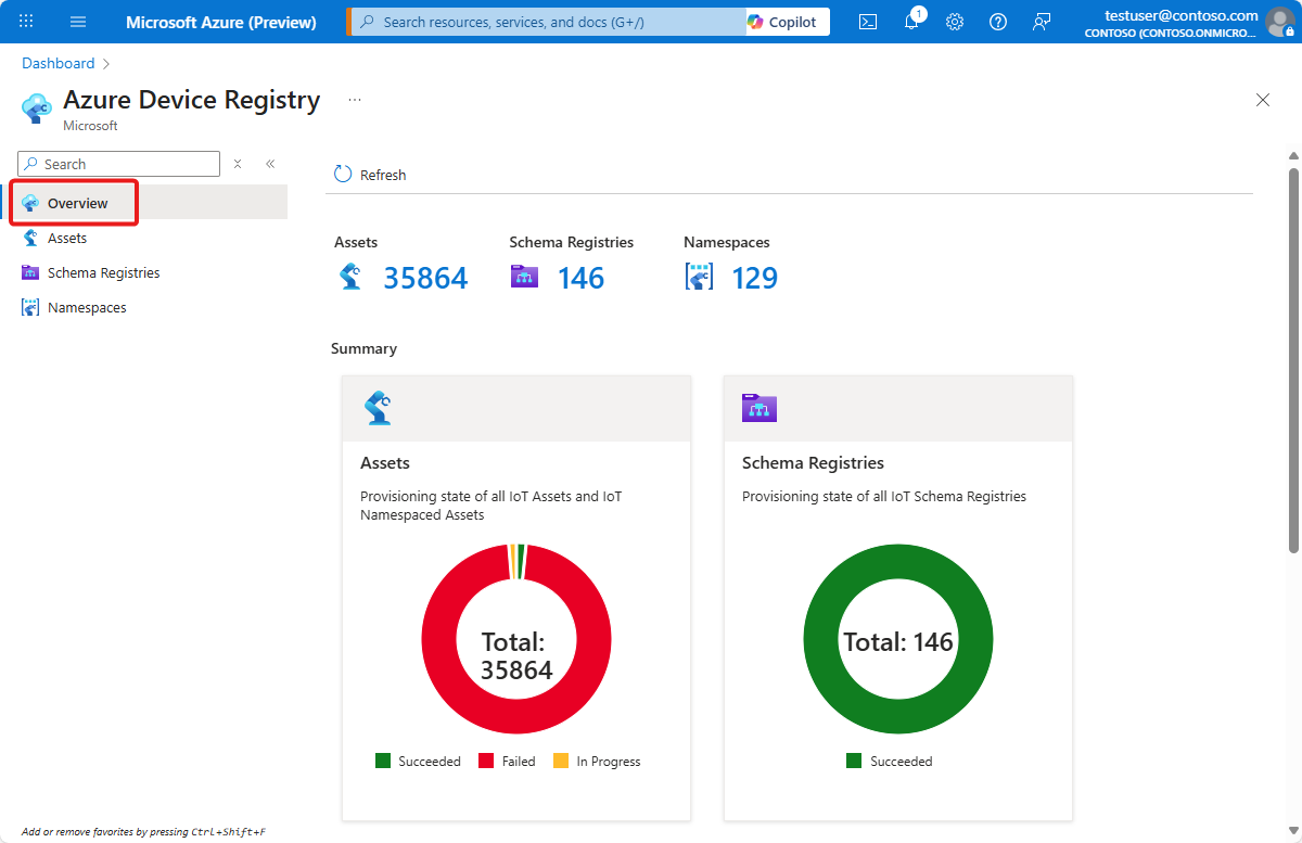 在 Azure 门户中,搜索并选择“Azure 设备注册表”。 “概述”页汇总了订阅中的资产、架构注册表和命名空间的数量: