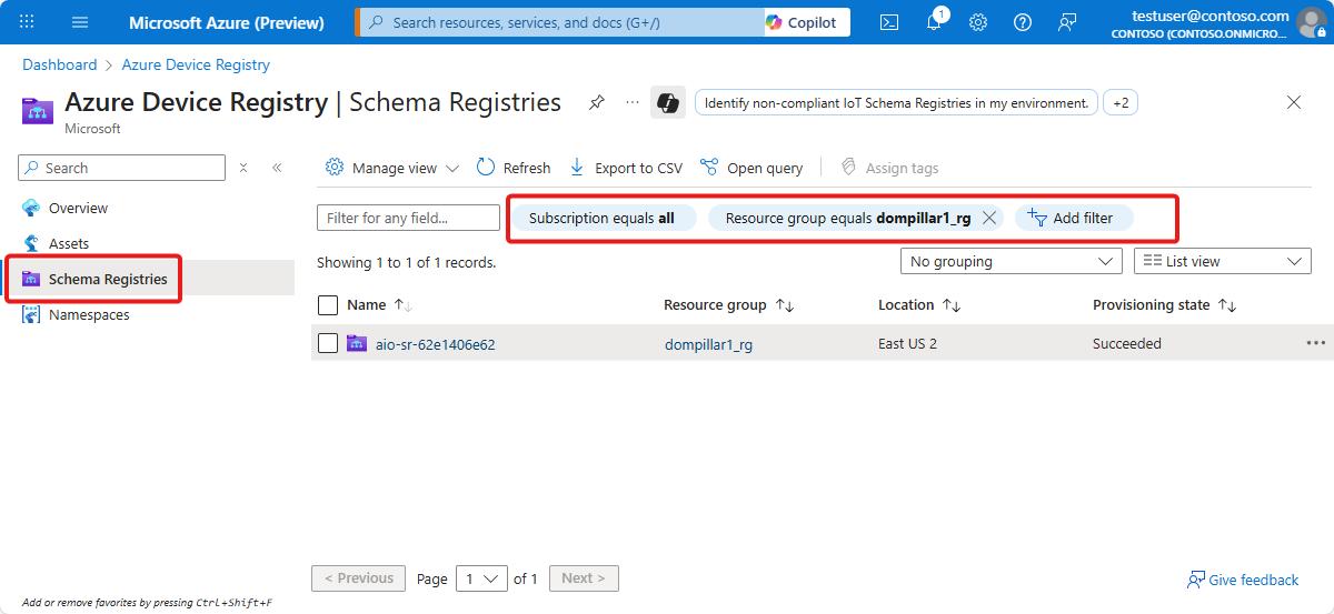 使用“架构注册表”页查看 Azure 设备注册表中的架构注册表。 默认情况下,“架构注册表”页显示订阅中所有命名空间中的架构注册表。 使用筛选器查看架构注册表子集,例如特定命名空间或资源组中的架构注册表: