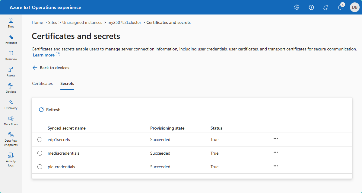 可以使用“机密”页查看设备和数据流终结点中已同步的机密。 “机密”页会显示所查看资源边缘的所有当前同步机密的列表。 同步的机密代表一个或多个机密引用,具体取决于使用它的资源。 应用于已同步机密的任何操作都将应用于已同步机密中包含的所有机密引用。