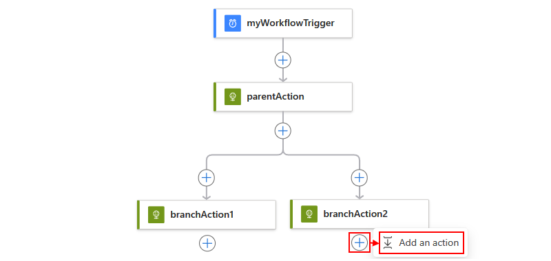 若要将另一个操作添加到并行分支,请在要添加新操作的操作下,选择加号 (),然后选择“添加操作”+。
