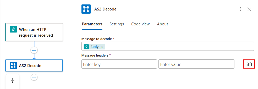 在操作的 消息标头 参数中,输入 AS2 操作所需的任何标头。 可以通过执行以下步骤,在