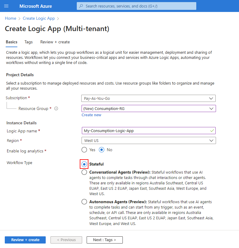 注意:本快速入门重点介绍如何创建非代理工作流。 如果未选择 有状态 选项,你不需要更改本节中的任何内容。 在不支持代理工作流的区域, 工作流类型 选项不可用。