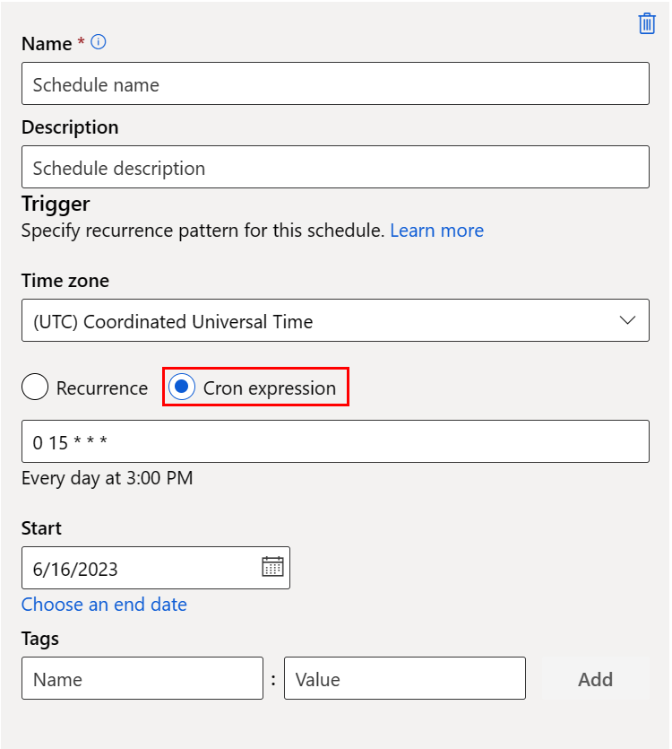 “开始”使用计划的时区指定开始日期和时间。 如果省略“开始”,则开始时间等于计划创建时间。 如果开始时间在过去,则第一个作业将在下一个计算的运行时间运行。