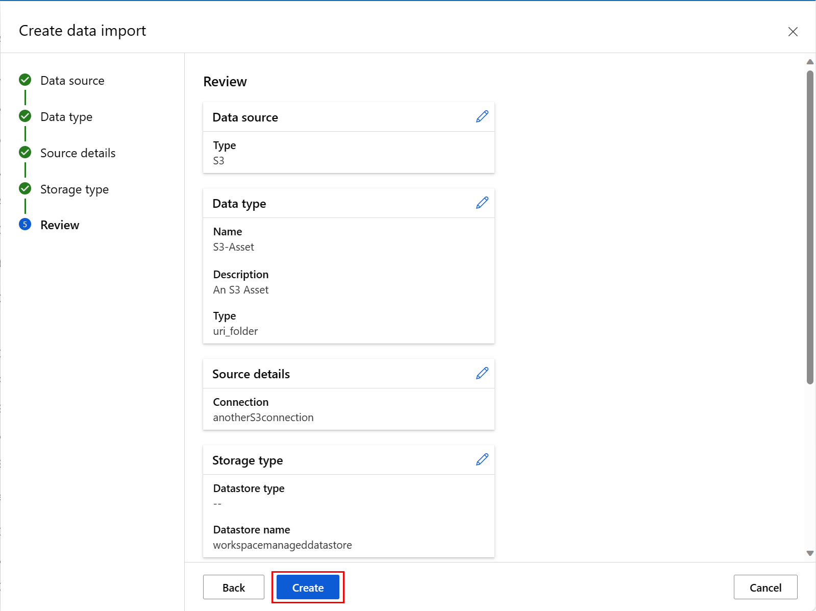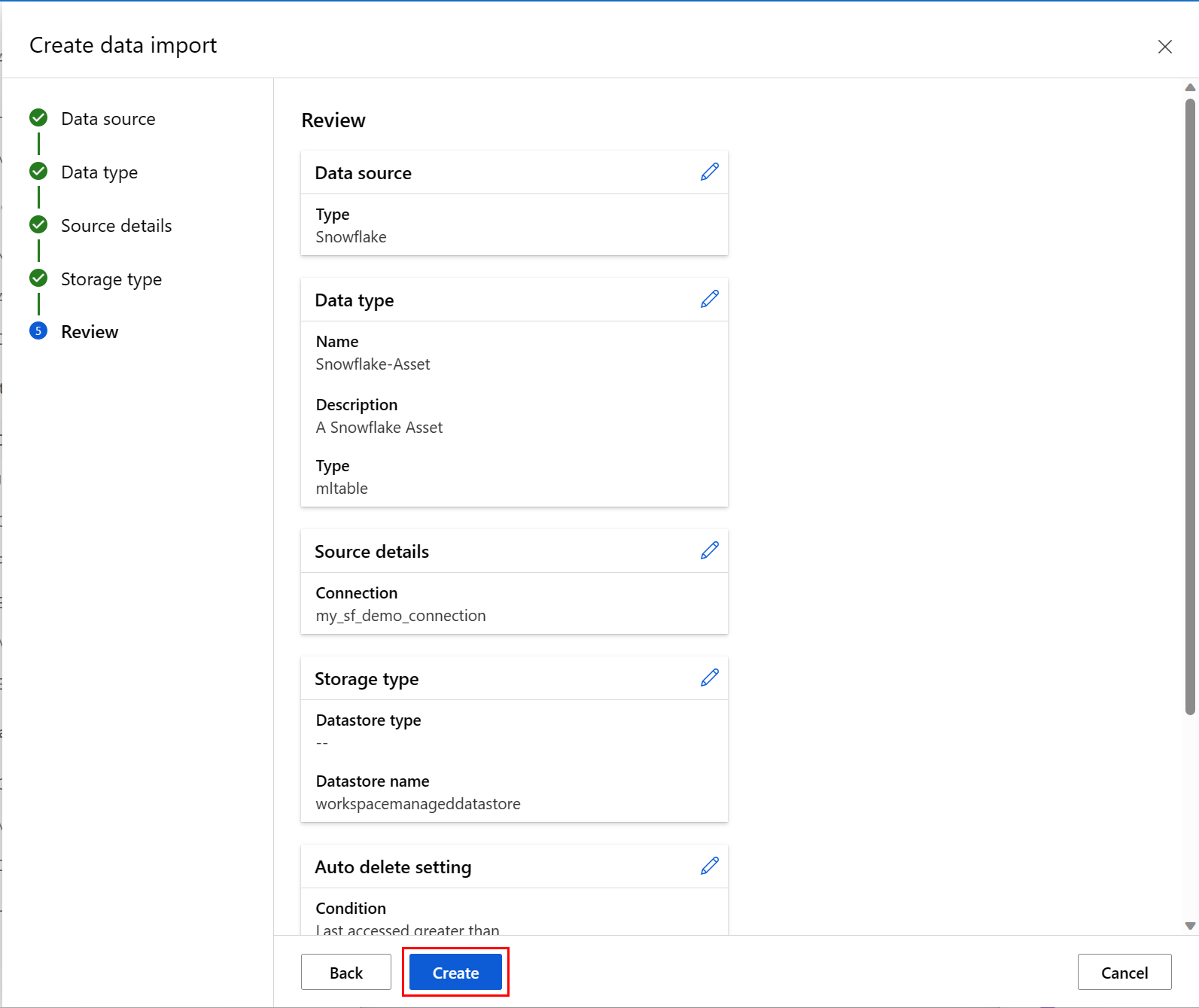 如下一个屏幕截图所示,在此过程的最后一个屏幕中检查选择,然后选择“创建”。 在此屏幕和此过程的其他屏幕上,如果要更改值选择,可选择“返回”移动到之前的屏幕。