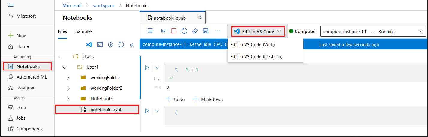 使用 VS Code 作为工作区的集成开发环境 (IDE)。 此选项提供了一个功能完备的开发环境,用于构建机器学习项目。