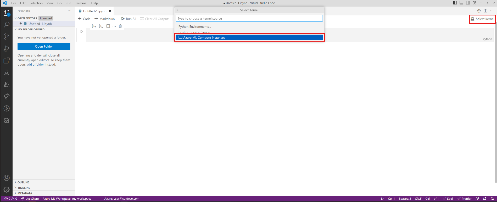 此选项允许你从 Visual Studio Code(桌面版)将计算实例用作远程 Jupyter 笔记本服务器。 此选项仅连接到计算实例,不会连接到工作区的其他实例。 使用此选项时,你不会在 VS Code 中看到自己的工作区文件。