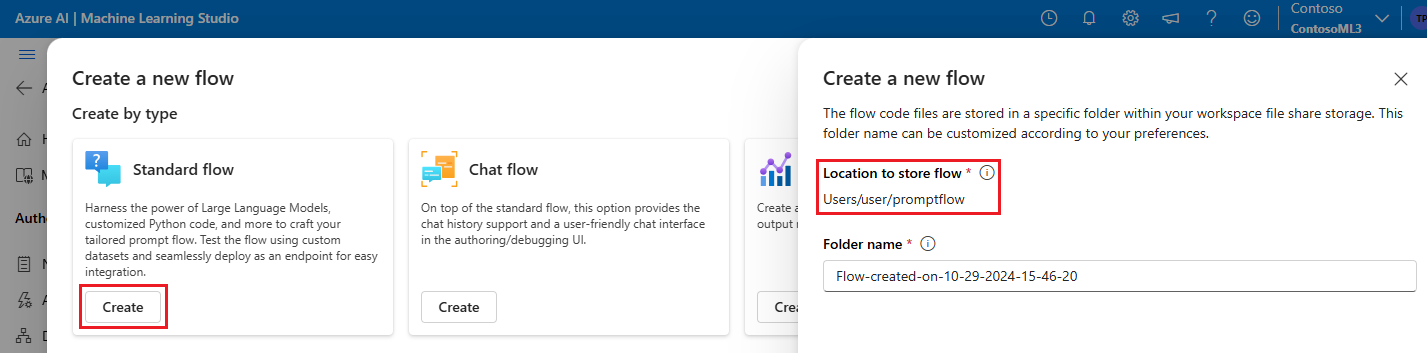 Azure 机器学习为所有工作区用户提供一个共享文件系统。 创建流后,一个相应的流文件夹自动生成并被存储在“Users/<username>/promptflow”目录中。