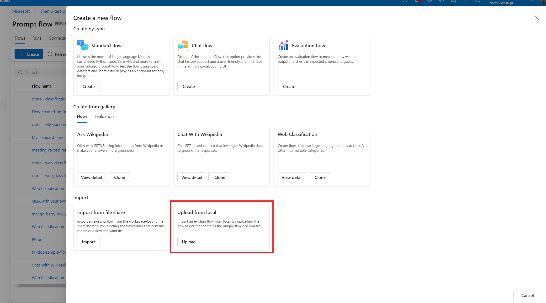 本地和云之间的平滑转换。 可轻松地将流文件夹导出到本地或上游代码存储库,以便进行版本控制、本地开发和共享。 还可毫不费力地将流文件夹导入回 Azure 机器学习,以便使用云资源进一步创作、测试和部署。