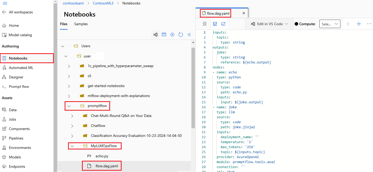 如果更喜欢直接在代码中工作,或使用 Jupyter、PyCharm、Visual Studio 或其他集成开发环境 (IDE),可直接修改 flow.dag.yaml 文件中的 YAML 代码。