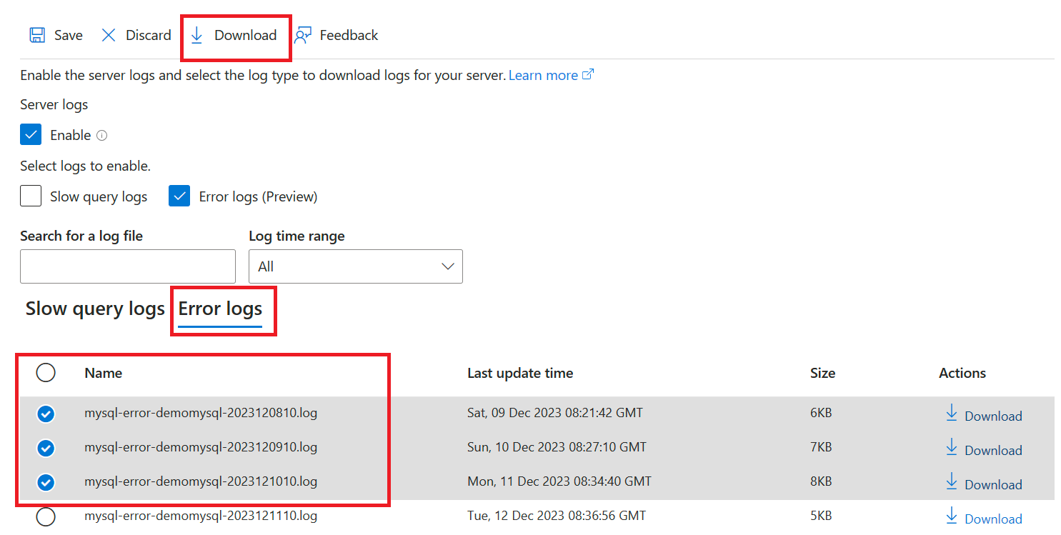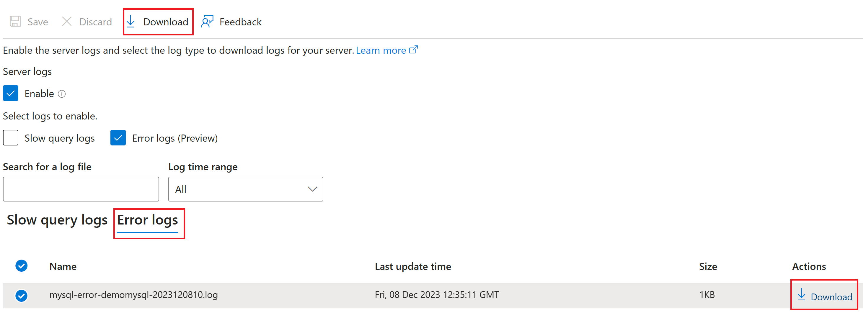 可以下载错误日志,以便进一步分析 Azure Database for MySQL 灵活服务器。 若要下载日志,请在 Azure 门户中导航到“服务器日志”部分,然后选择“错误日志”选项卡,如下所示。