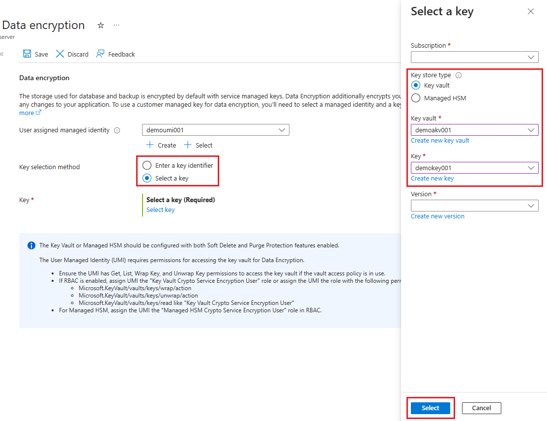 - 选择“更改标识”,选择“用户分配的托管标识”,然后选择“添加”若要选择密钥,可以选择密钥保管库和密钥对,或输入密钥标识符