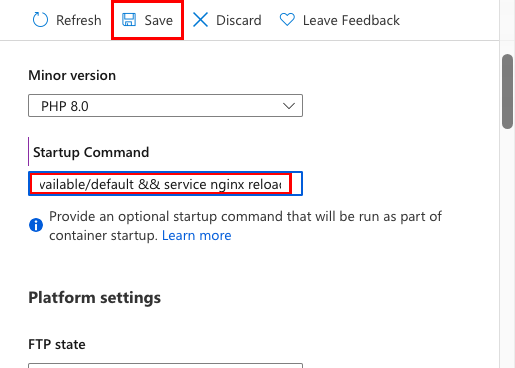 Laravel 应用程序生命周期在 /public 目录中开始。 应用服务的默认 PHP 8.0 容器使用 Nginx,该服务器从应用程序的根目录中开始。 若要更改站点根路径,需要在 PHP 8.0 容器 (/etc/nginx/sites-available/default) 中更改 Nginx 配置文件。 为方便起见,示例存储库包含一个名为 default 的自定义配置文件。 如前所述,你不想使用 SSH shell 替换此文件,因为在应用重启后,更改将丢失。