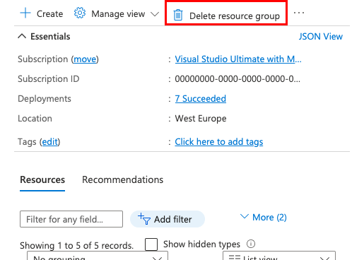 完成后,可以通过删除资源组从 Azure 订阅中删除所有资源。
