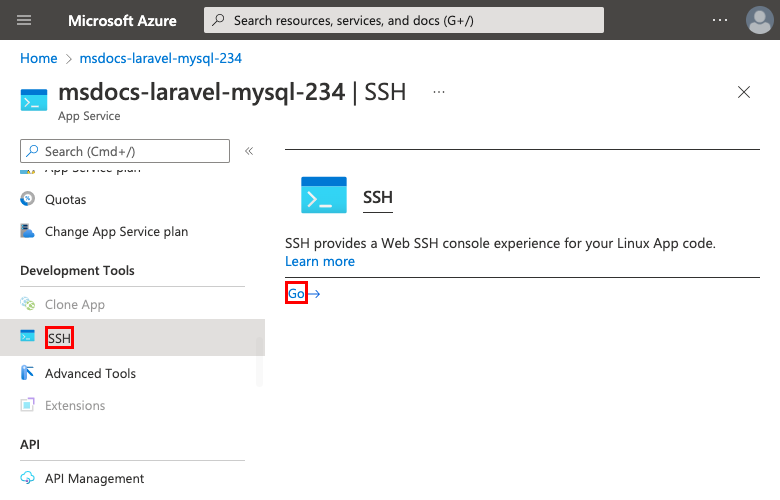创建向导将 Azure Database for MySQL 灵活服务器实例置于专用终结点后面,因此只能从虚拟网络访问它。 由于应用服务应用已与虚拟网络集成,因此使用数据库运行数据库迁移的最简单方法是直接从应用服务容器中运行。