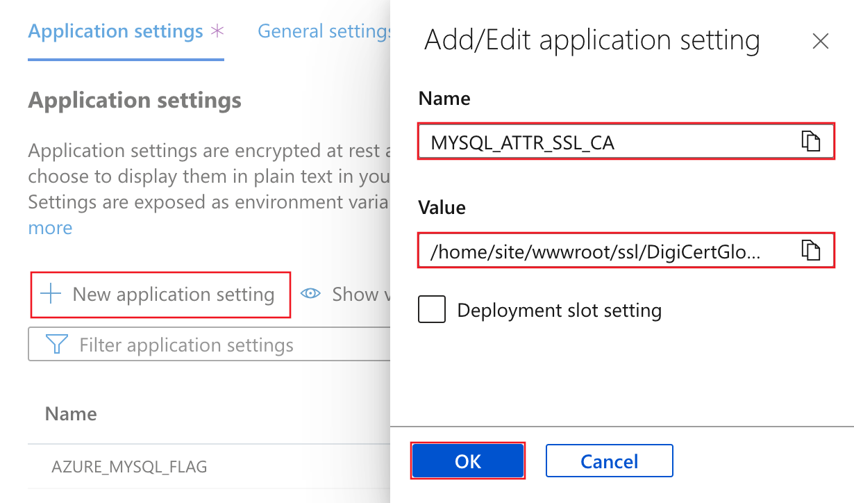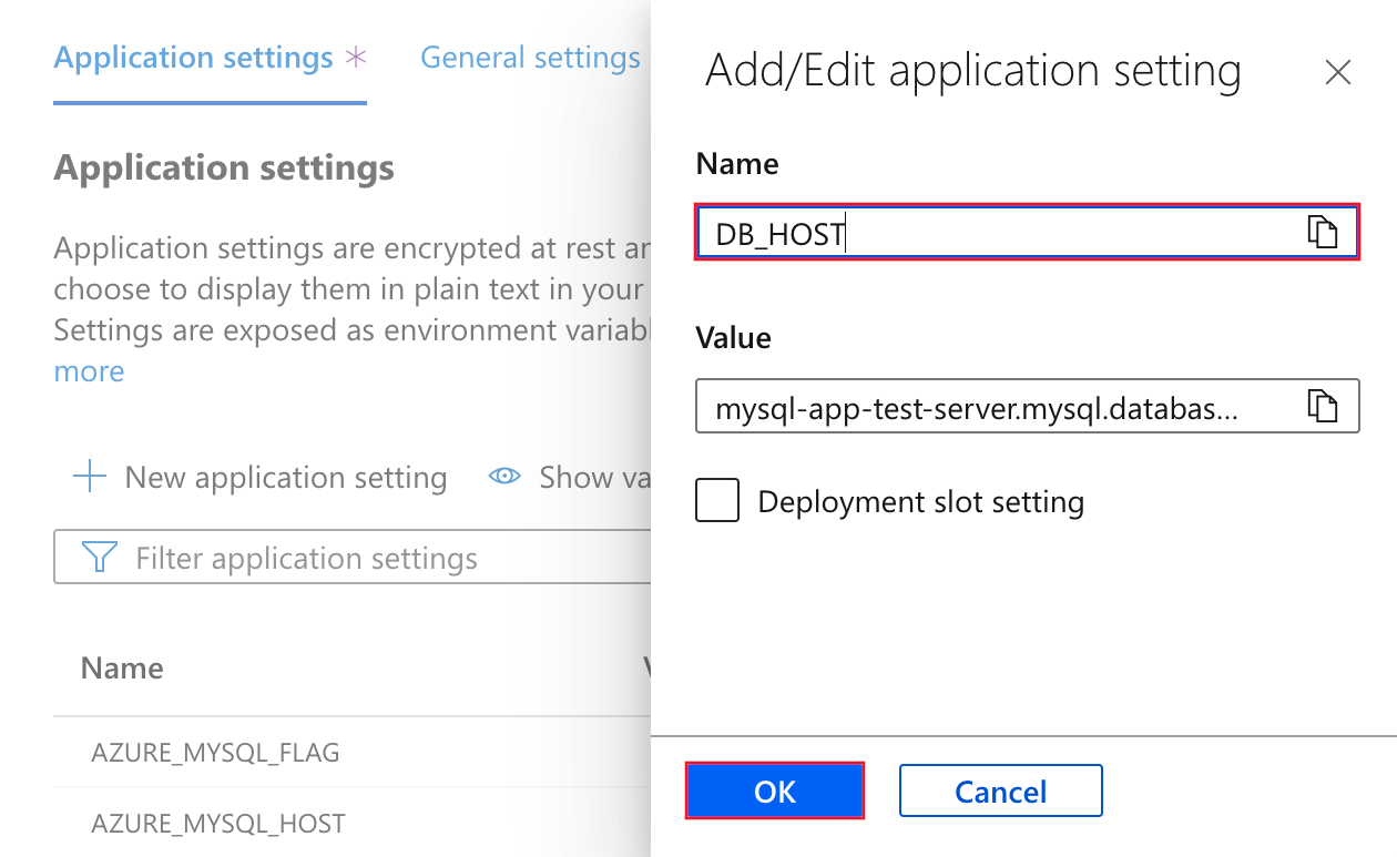 - 使用应用设置将连接机密配置到 MySQL