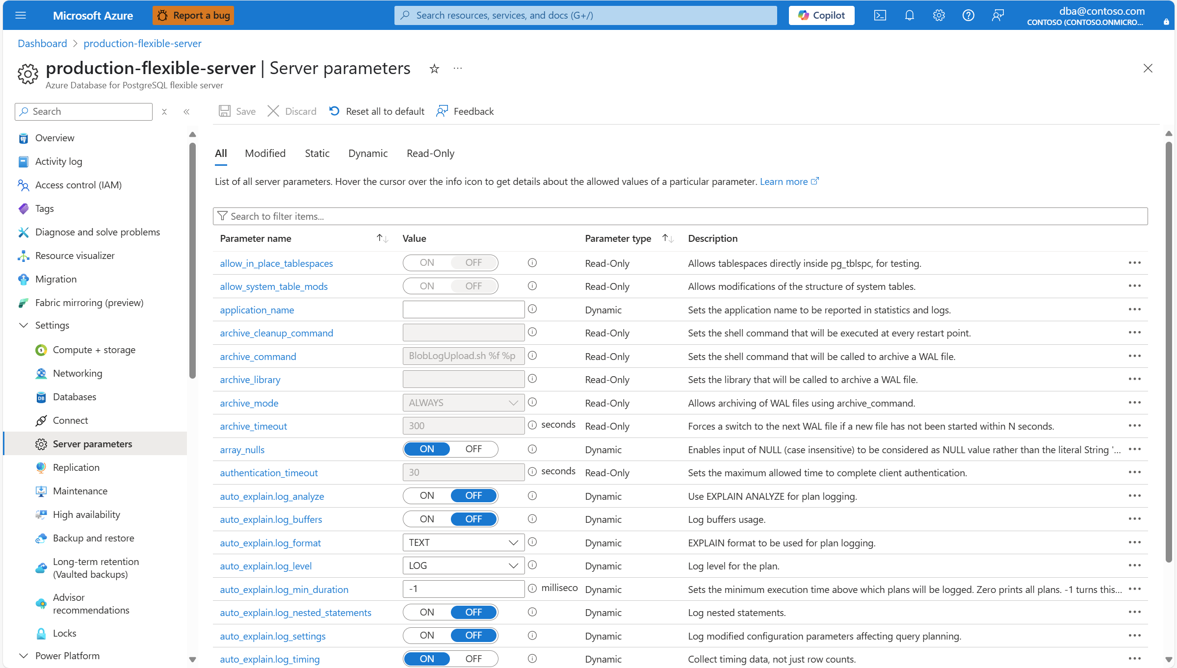 从资源菜单的“设置”部分下,选择“服务器参数”。