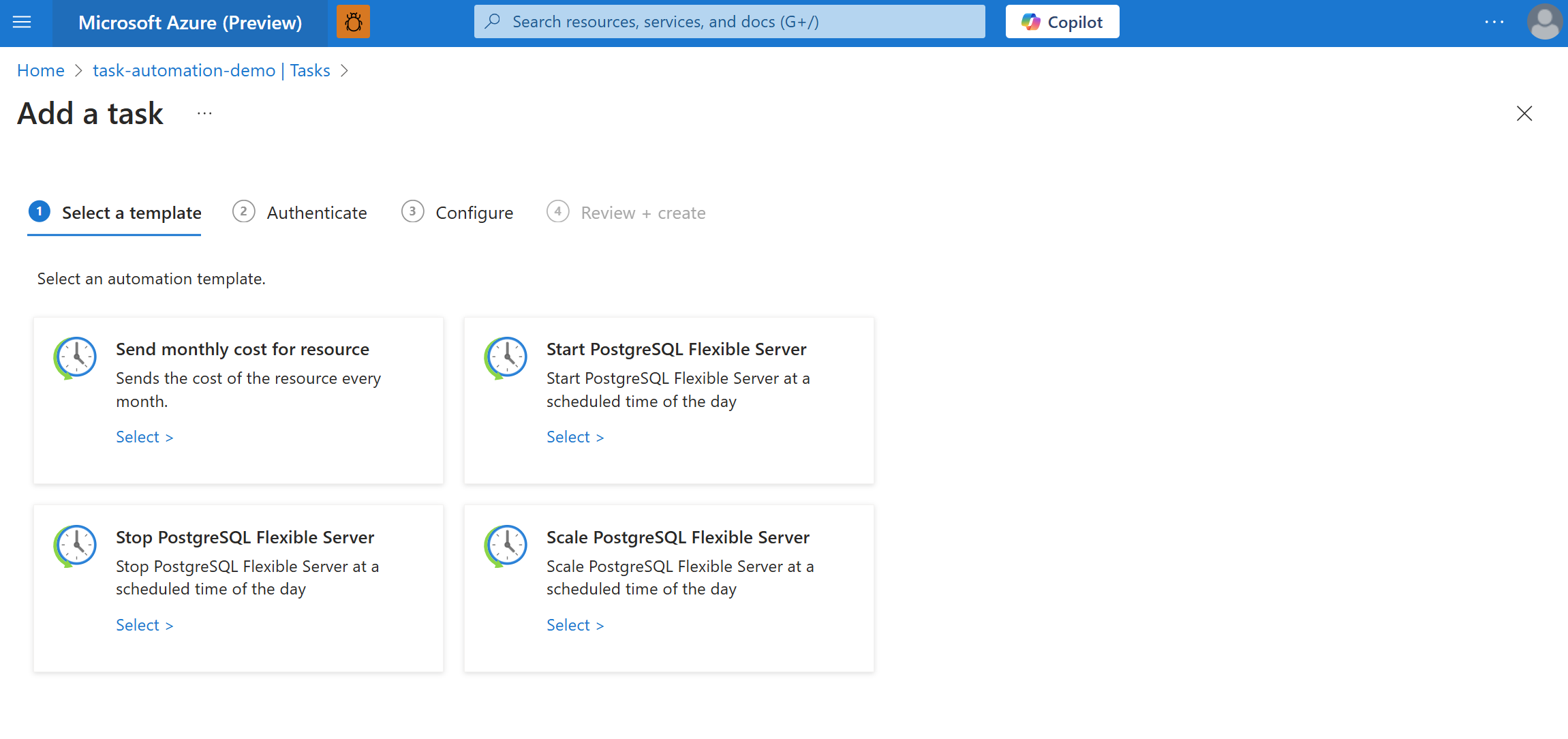 你还可以为其他常规任务(例如“发送资源的每月成本”和“缩放 Azure Database for PostgreSQL ”)设置自动化任务。
