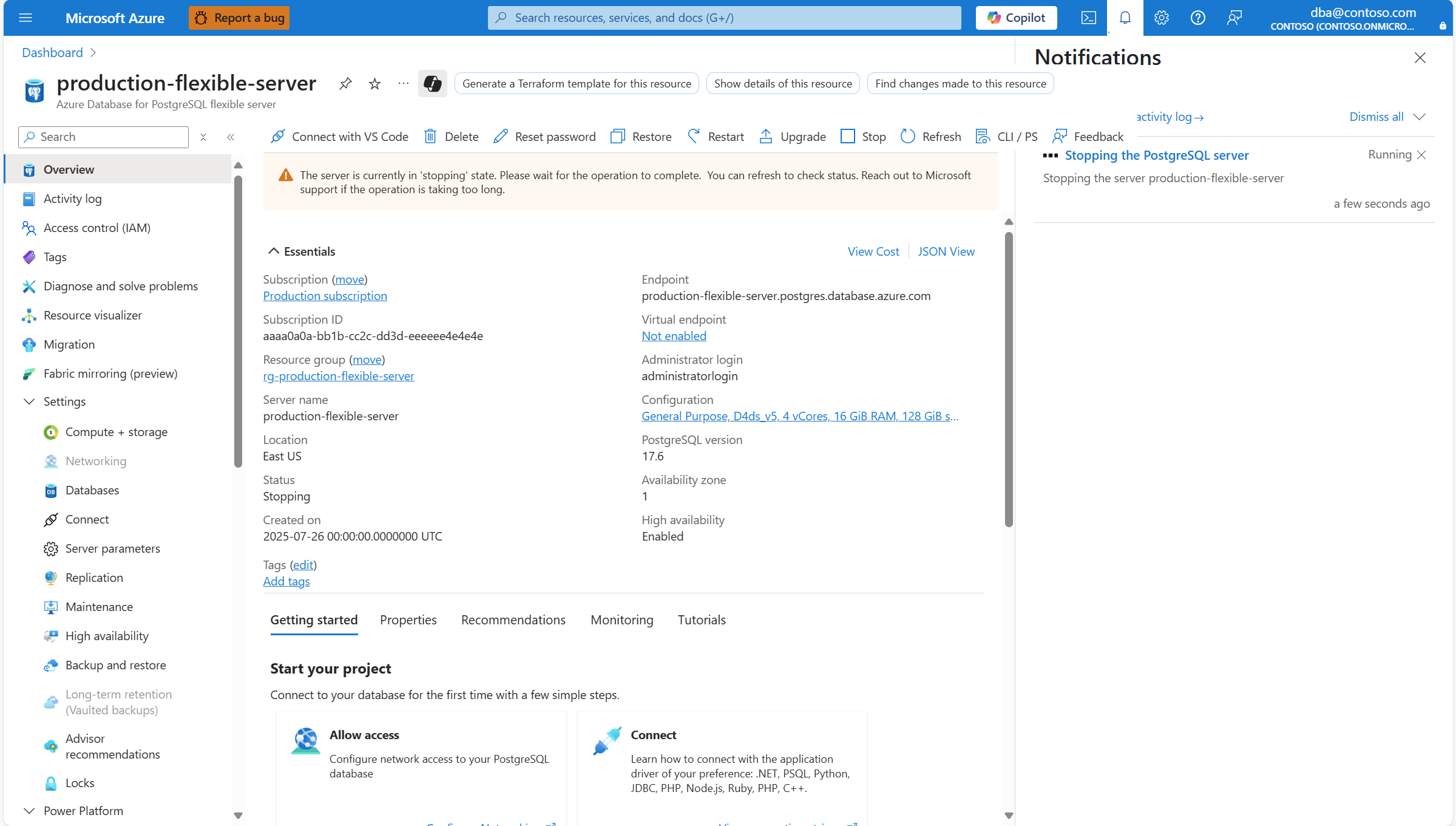 在服务器停止后,其他管理操作将不再可用于 Azure Database for PostgreSQL 灵活服务器实例。 虽然 Azure Database for PostgreSQL 灵活服务器处于停止状态,但可以出于计划的每月维护的需要临时重启,之后再恢复为停止状态。 此过程可确保即使处于停止状态的实例也能完成所有必要的修补升级,保持最新状态。