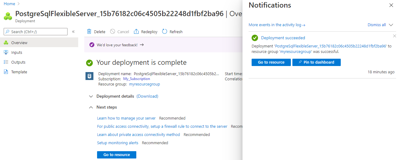 现可监视部署的进度。 完成部署后,可以选择“固定到仪表板”,以便在 Azure 门户仪表板上为此服务器创建磁贴作为到此服务器“概述”页的快捷方式。 选择“转到资源”可打开此服务器的“概述”页。