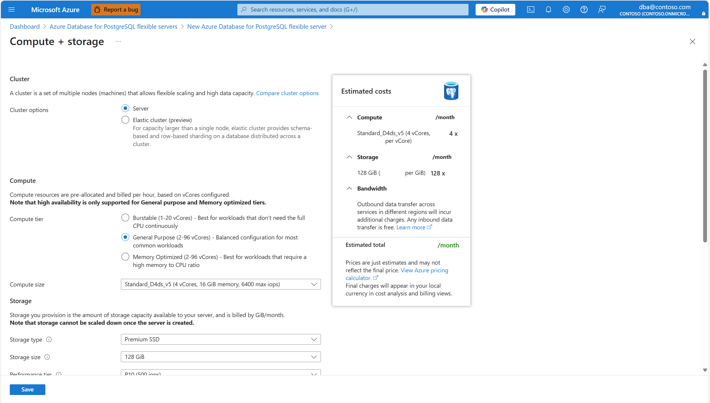 9. 若要进一步配置计算和存储,请在“服务器详细信息”下的“计算 + 存储”部分中,选择“配置服务器”。 此时将打开“计算 + 存储”页,可在其中配置特定于要使用的计算和存储类型的多个设置。 根据需求配置计算和存储后,选择“保存”以返回到“基本信息”页并继续配置实例