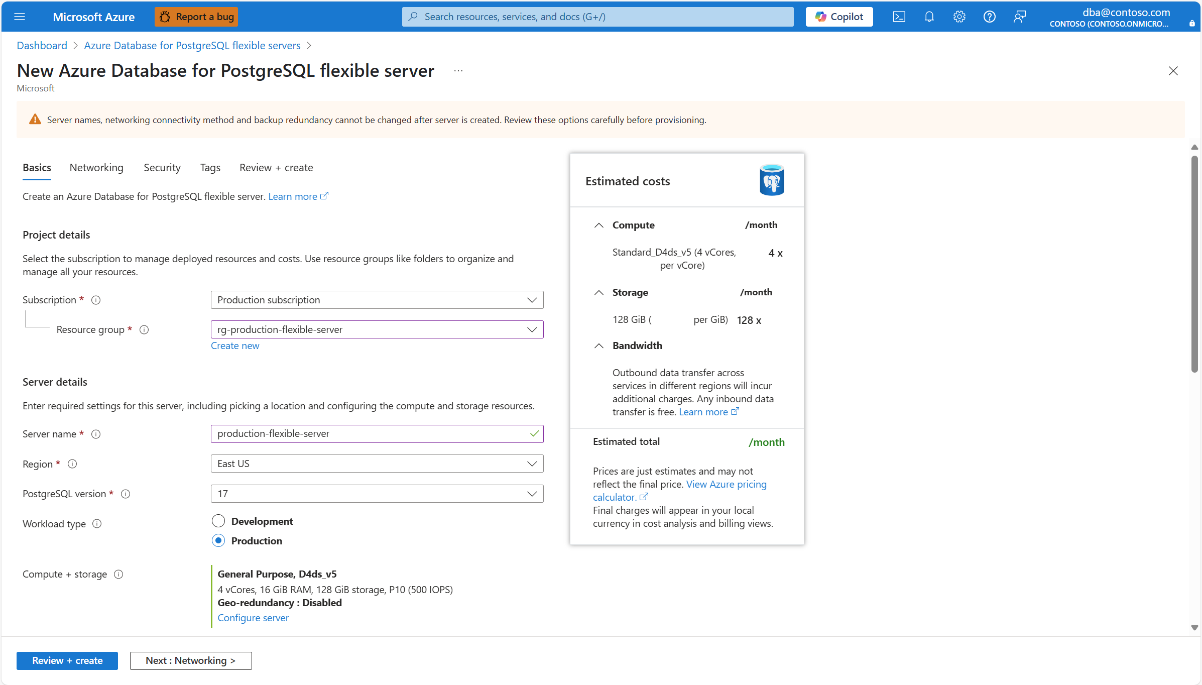 17. 在“标记”选项卡中提供所有必需信息后,选择“下一步: 查看 + 创建”转到“查看 + 创建”选项卡,可以在其中查看触发创建之前为新的 Azure Database for PostgreSQL 灵活服务器实例配置的所有设置: