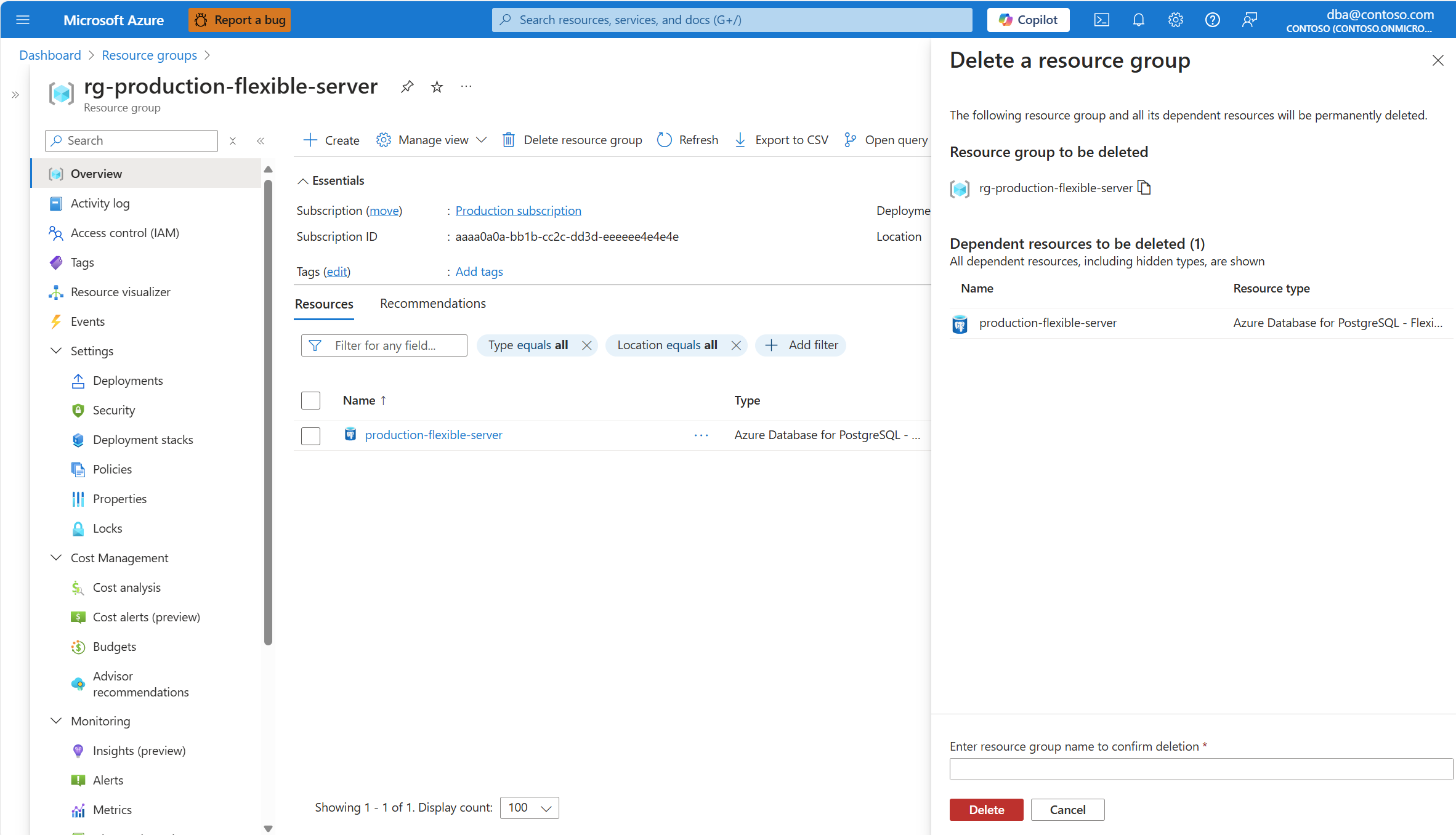 显示如何确认删除资源组的屏幕截图。