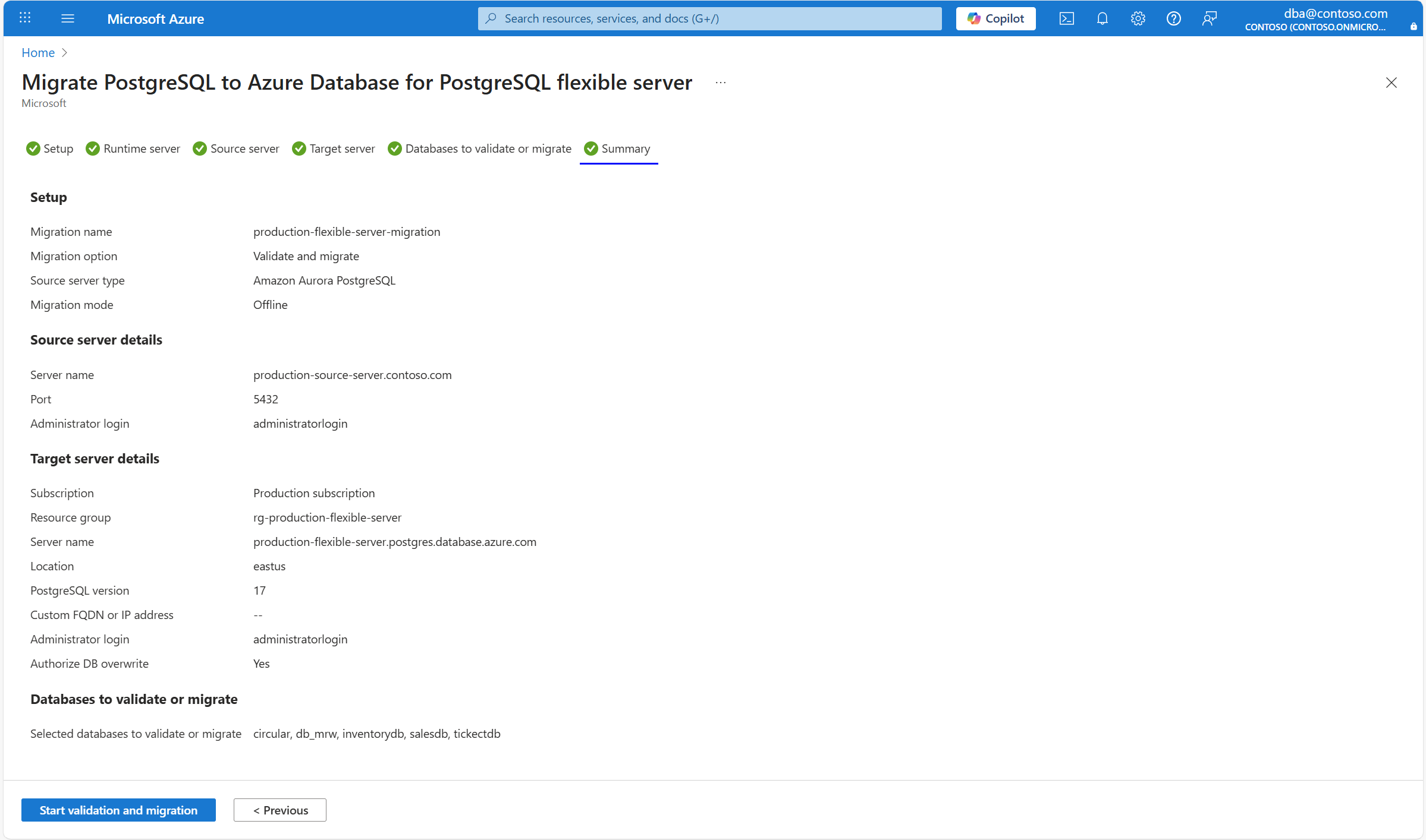 “摘要”选项卡汇总了用于创建验证或迁移的所有源和目标详细信息。 查看详细信息,然后选择 “开始验证和迁移”。