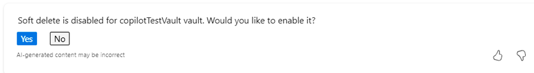 在 Azure 门户的 Copilot 上,使用提示“提高保管库的安全级别”。Copilot 提供了一系列启用各种安全功能的步骤。