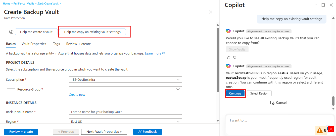 在 Copilot 窗格上,会出现来自常用区域的保管库。 若要使用建议的保管库复制设置,请选择“ 继续”。