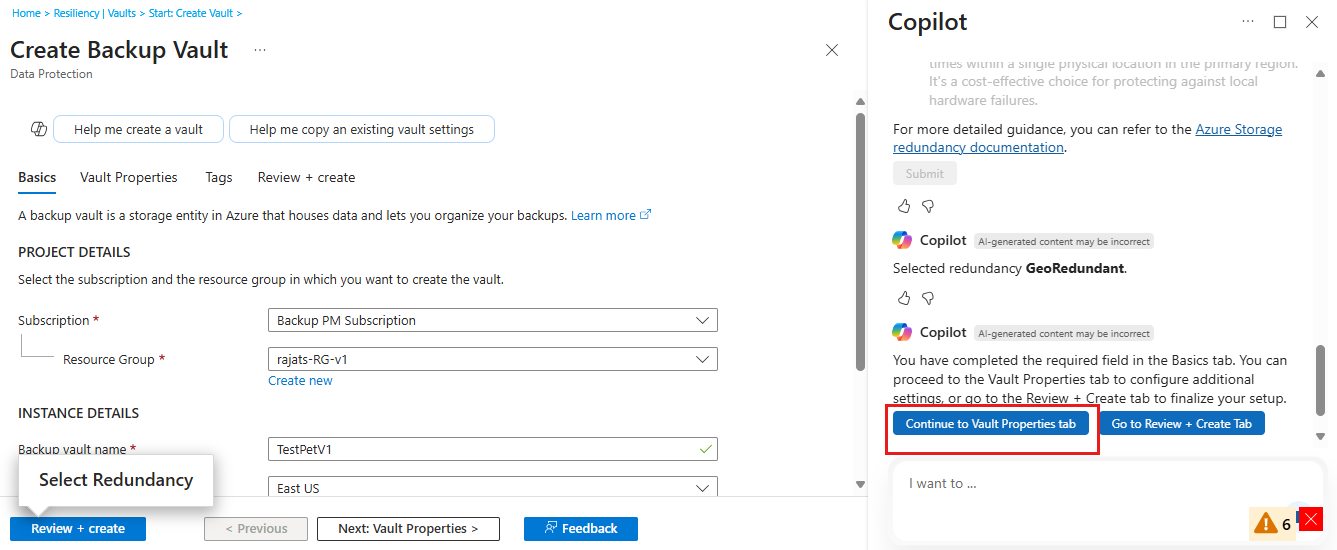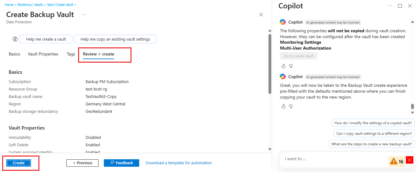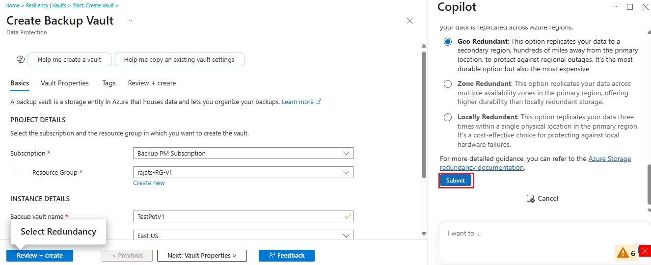 成功复制保管库设置后,在 Copilot 窗格中输入 备份保管库名称,然后选择“ 提交”。