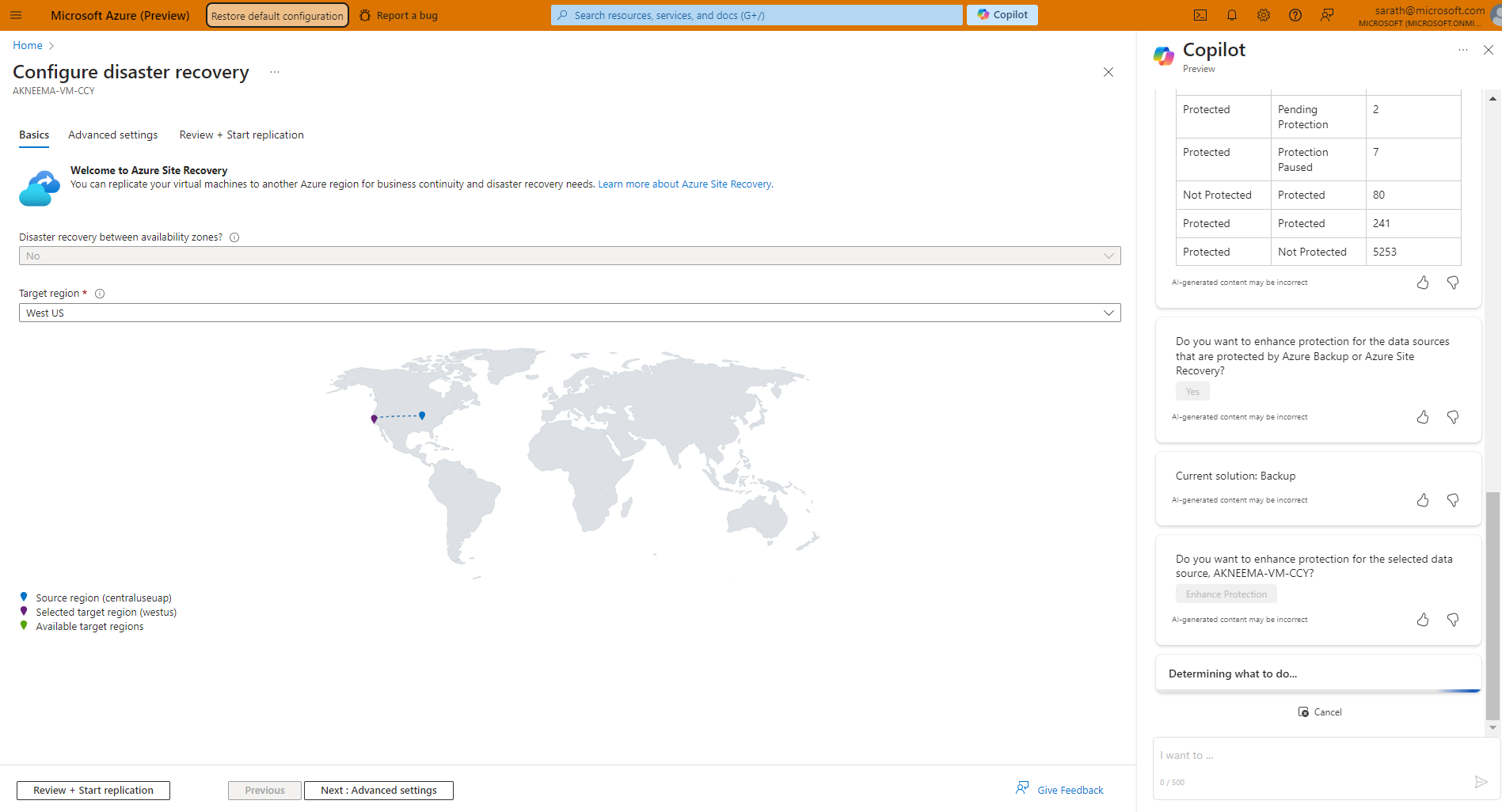 借助复原能力 Copilot,可以直接使用自然语言在 Azure 门户中检查 Azure 资源的保护状态。 Copilot 可检索有关资源及其保护状态的信息,并引导完成相关流程。