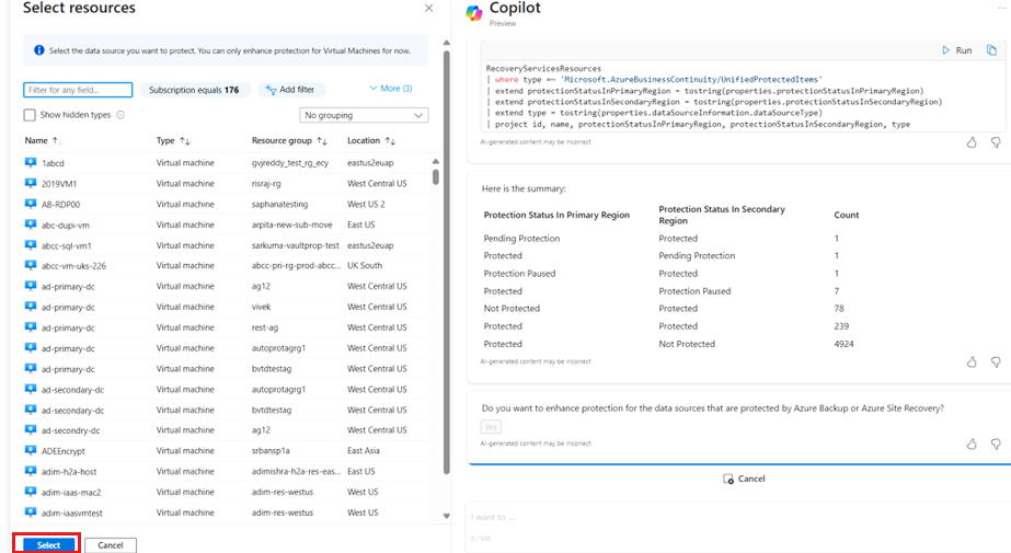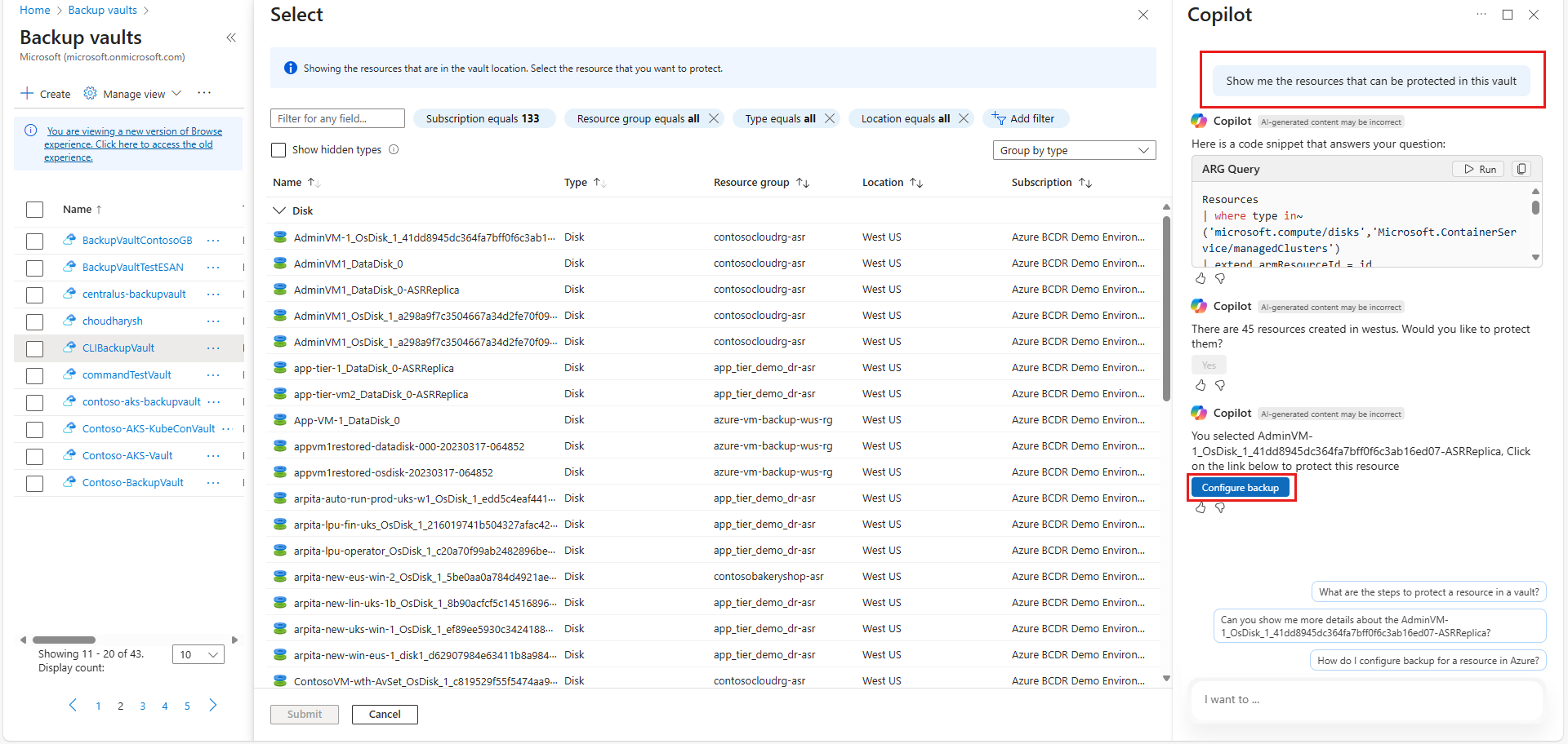 在 Copilot 窗格中,使用提示“显示可在此保管库中保护的资源”。