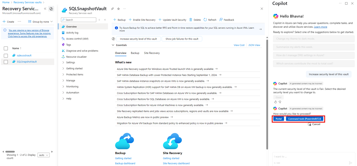 命令工具(PowerShell/CLI)使您可以通过命令行启用保管库安全功能,Copilot 提供了用于激活的示例命令。