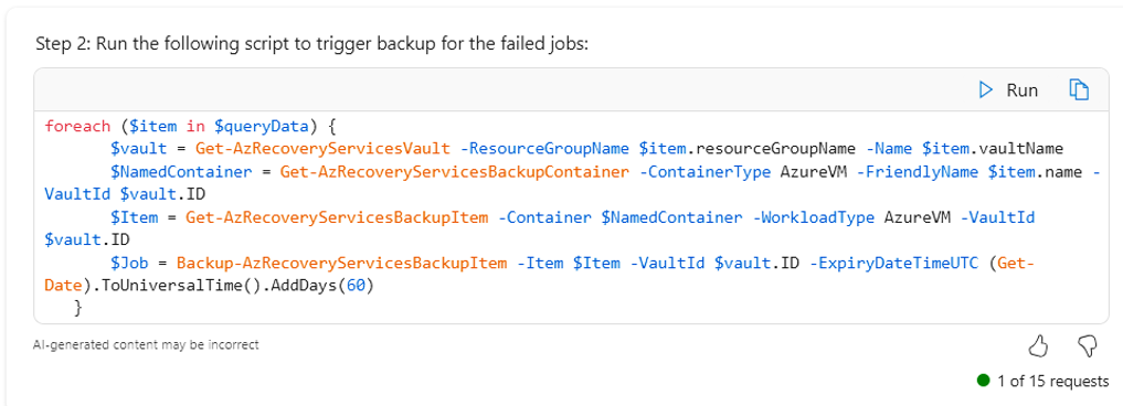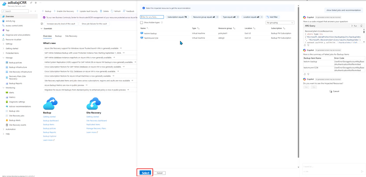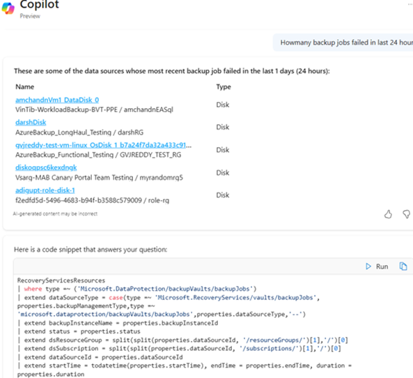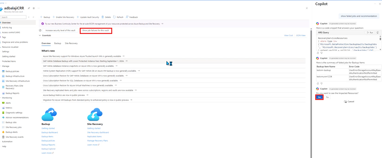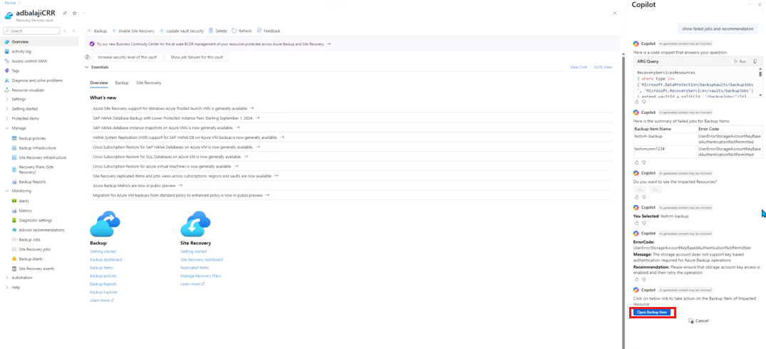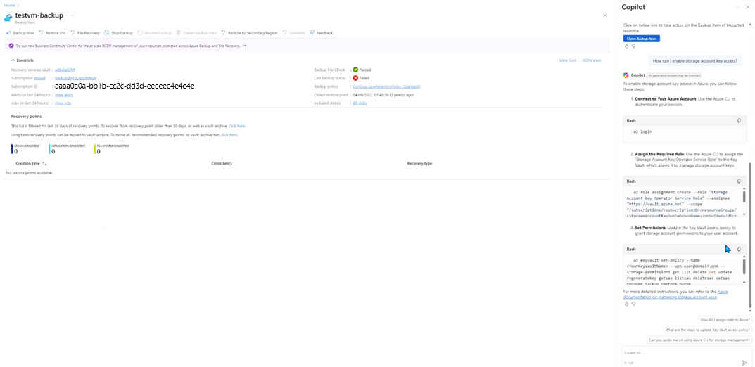 可以使用 Copilot 对与恢复服务保管库或备份保管库关联的作业失败进行故障排除。