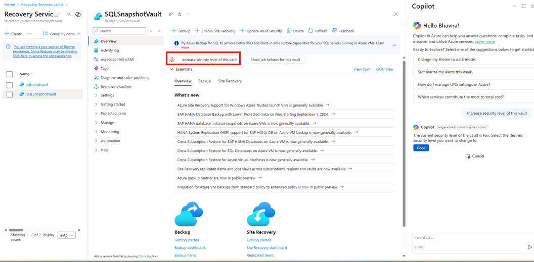 Azure Copilot 中的复原能力功能提供了提高保管库安全级别的选项。 可以在保管库窗格中找到此选项。