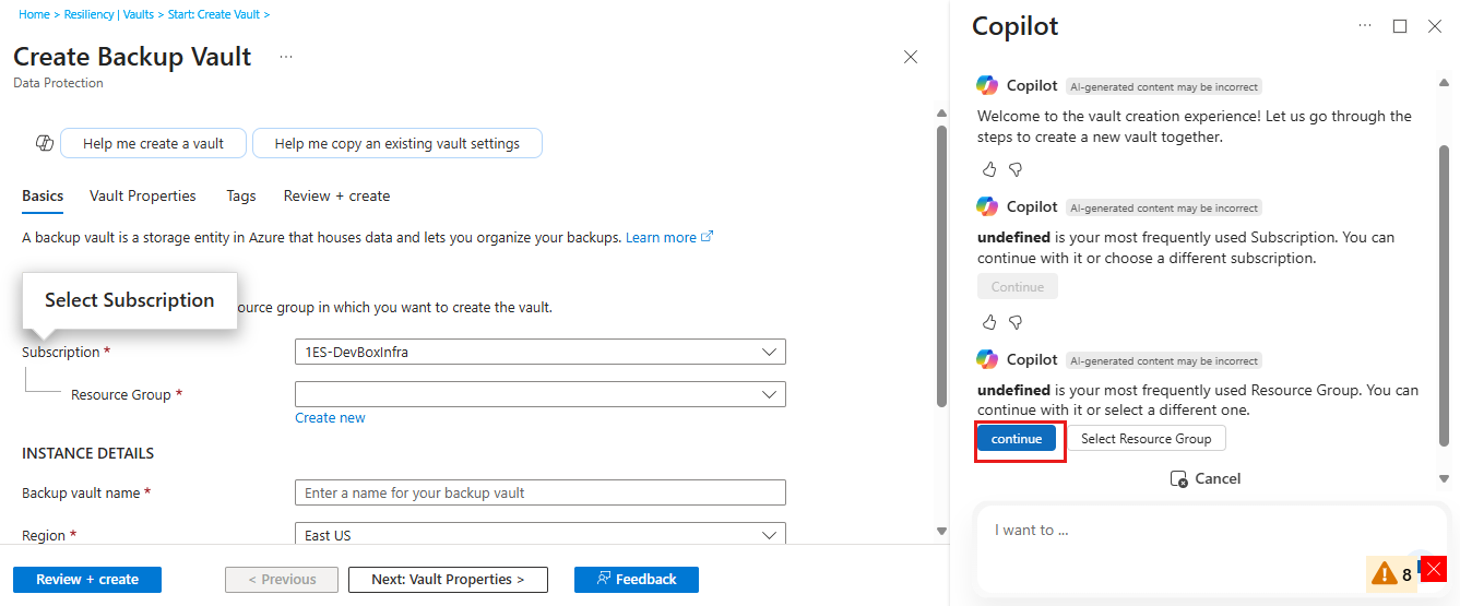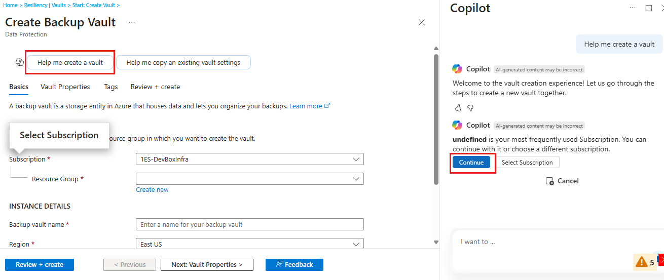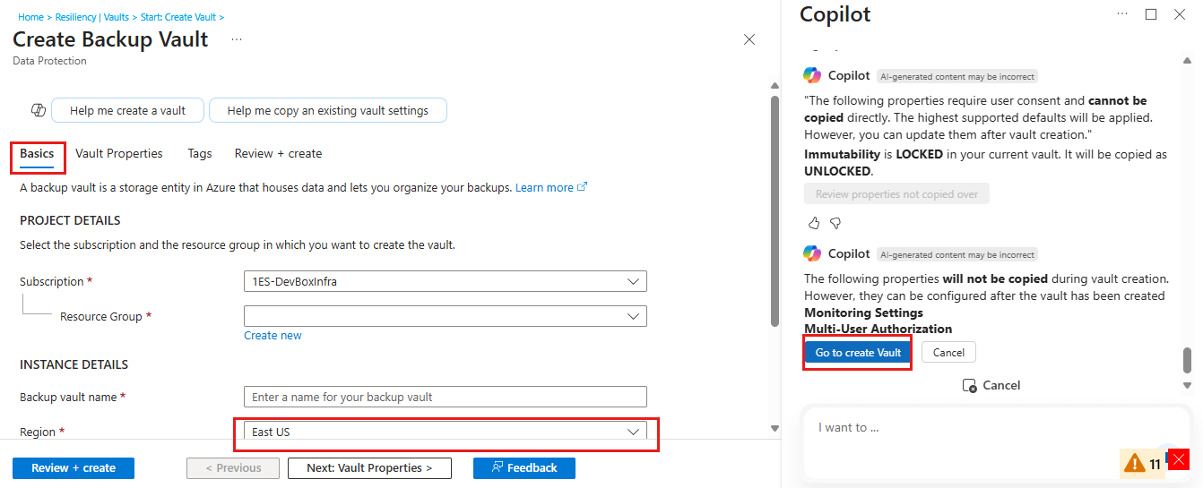 若要使用复原能力 Copilot 创建备份保管库,请执行以下步骤: